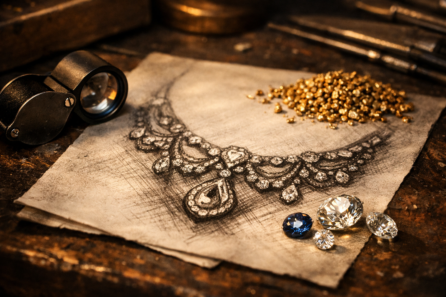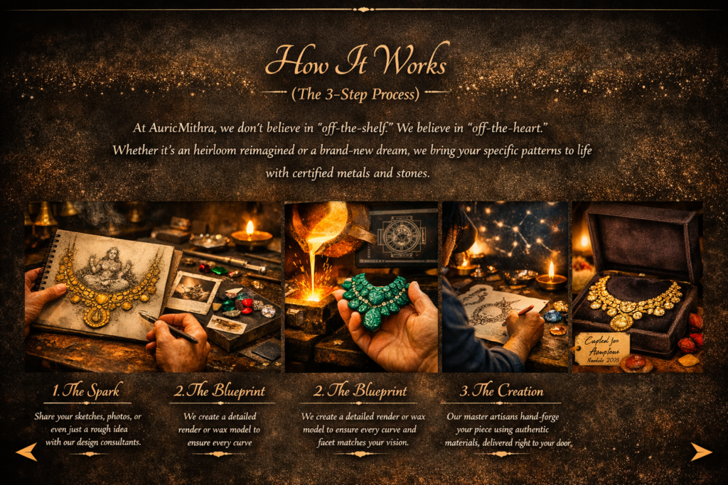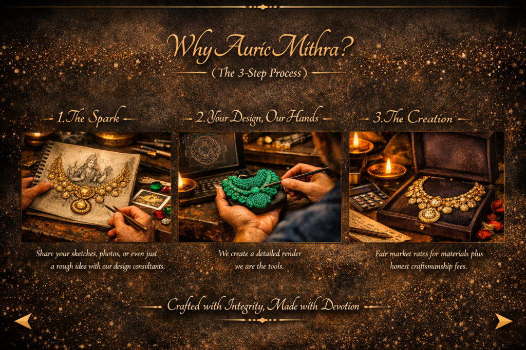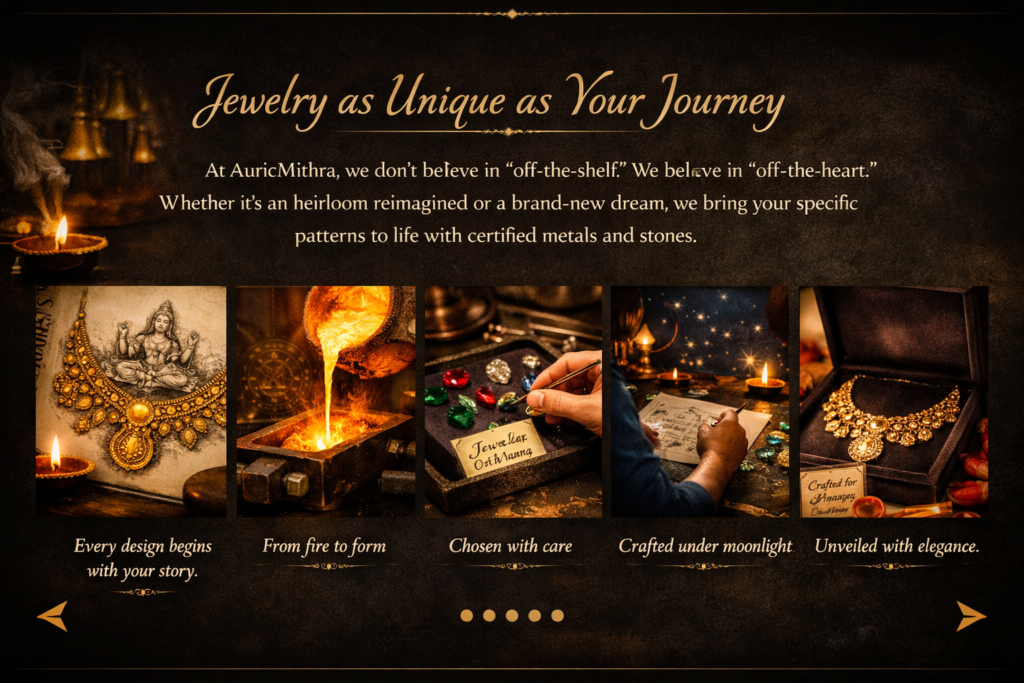 At AuricMithra, we don’t believe in “off-the-shelf.” We believe in “off-the-heart.” Whether it’s an heirloom reimagined or a brand-new dream, we bring your specific patterns to life with certified metals and stones.